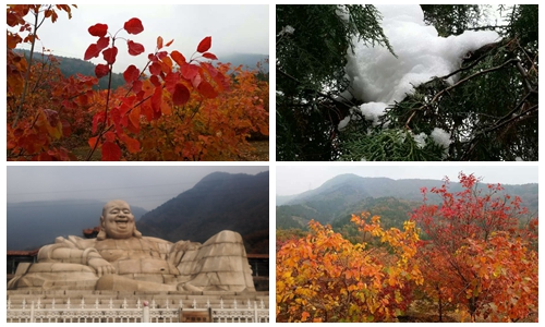游览当日,时值天气多云,凉风习习。在山脚下,一座由我国著名雕塑家赵树桐教授设计的高达9.9米,重1500余吨,由200块5-10吨重的花岗石雕刻成的弥勒大佛,吸引了大家的目光。拍照、观赏过后,沿着一条由3666块条石铺就的登山台阶拾级而上,在半山腰偶有雨丝扑面;再往上,零星的雪花不时飘洒到地面、身上……有雨雪之趣而无淋漓之苦,反而平添了一份平时体验不到的乐趣。有时,堆积在树枝上的雪块承受不住自身的重量,轰的一声散落在地上……到达山顶,是一条供游客小憩、观赏的彩绘长廊。长廊长150米,是北京最高的彩绘长廊,犹如一条卧龙隐现于云雾中。小憩之后,沿着台阶返身向下,相较于攀登的艰苦,顿时脚步轻松了许多,速度也快了许多。穿过山腰,视野更加开阔,经历几天阴雨之后久违的太阳终于露出了笑脸,每个人的心情也豁然开朗……