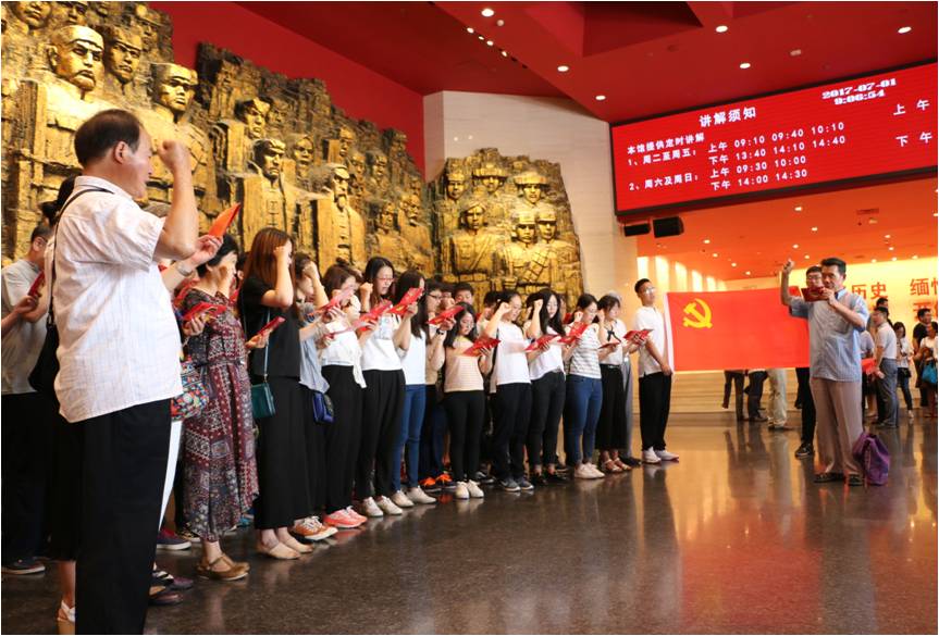 参观当天是我党成立96周年纪念日,在参观展览之前,在展厅的大型抗战浮雕前,由关工委副秘书长、老党员史湘太领誓,带领大家重温了入党誓词。
