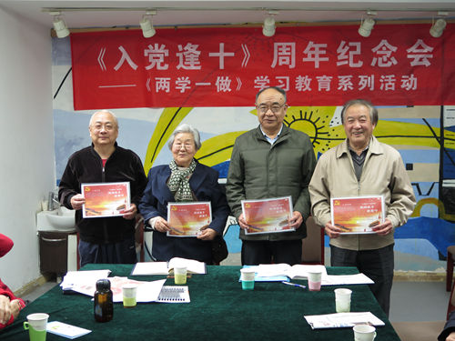 “入党逢十”周年纪念活动是支部近年来一项经常性的党性教育活动,支部已经连续三年开展该项活动,使其成为激发党支部活力、加强党性锻炼的良好平台和载体。今年恰逢支部五位党员分别入党40、30、20周年,五位党员在支部会上分别发言,谈了他们在党的哺育下的成长经历,表示要离职不离党,退休不退色,永远跟党走。老党员们深情的发言,充分表现了他们爱党爱国的情怀。支部给大家颁发了纪念证书,祝贺他们的政治生日,并勉励他们继续进步。